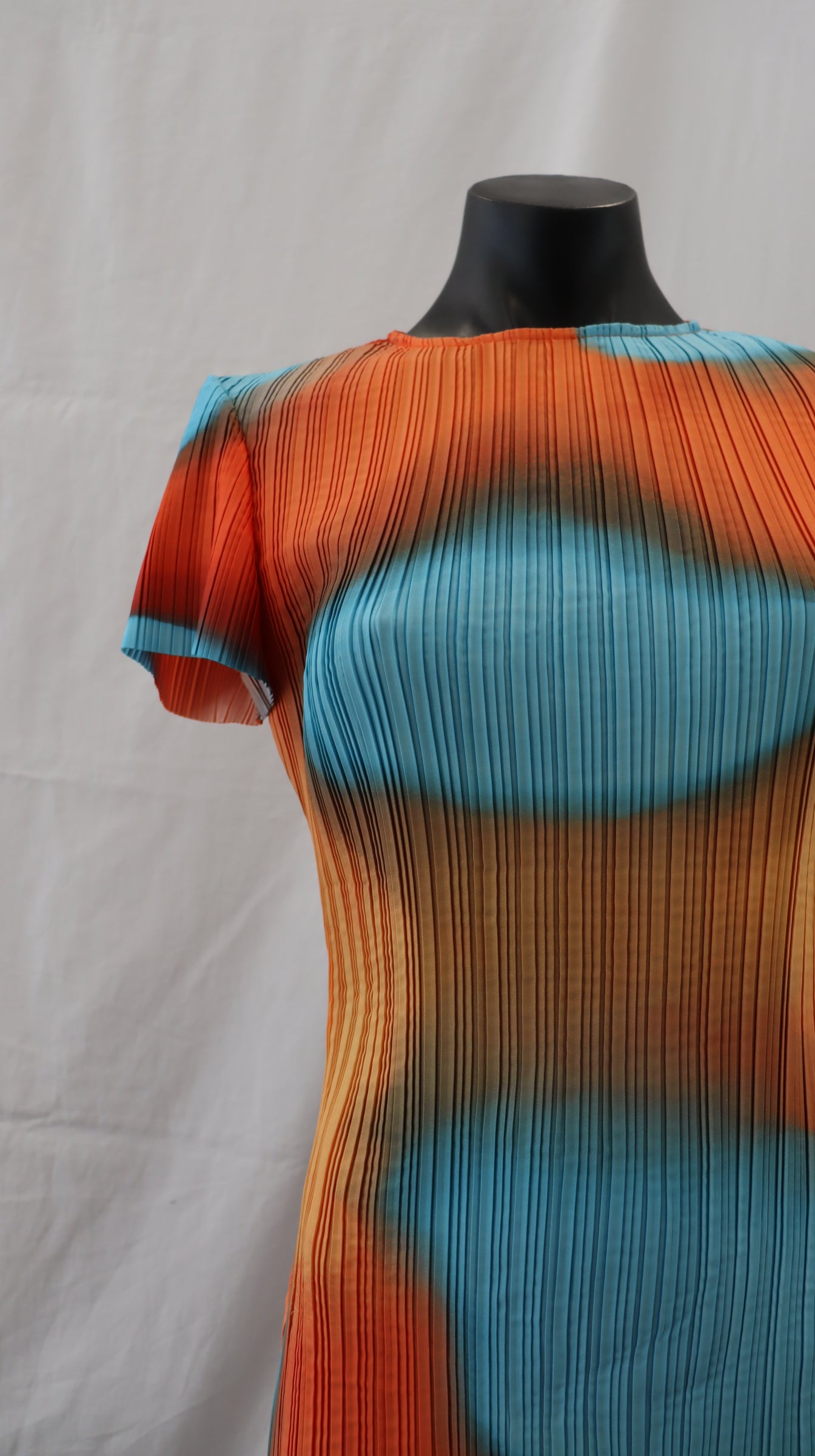 Blue and orange pattern, short sleeve, button on the back of neck with keyhole cutout, straight cut, pressed pleat material