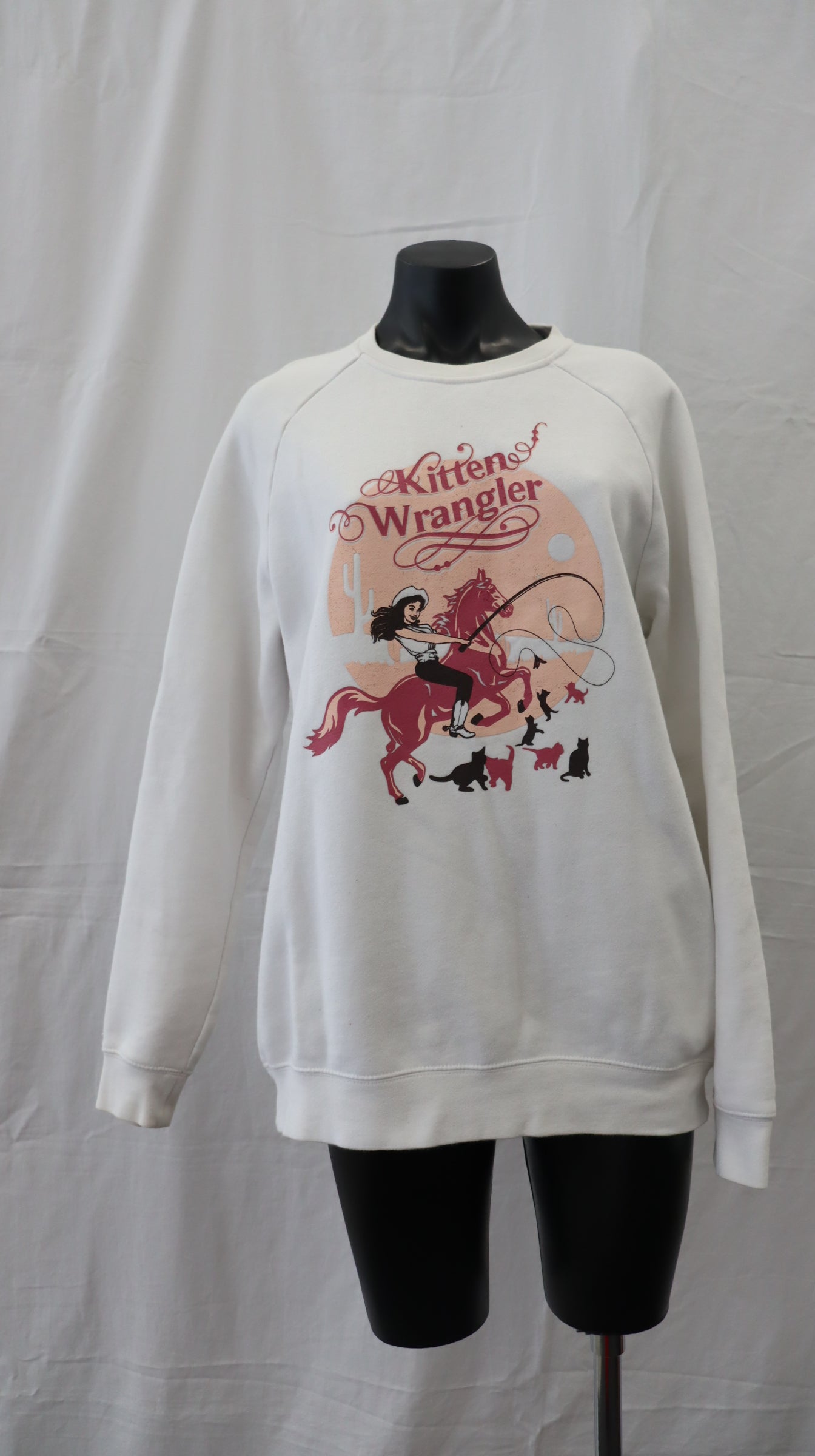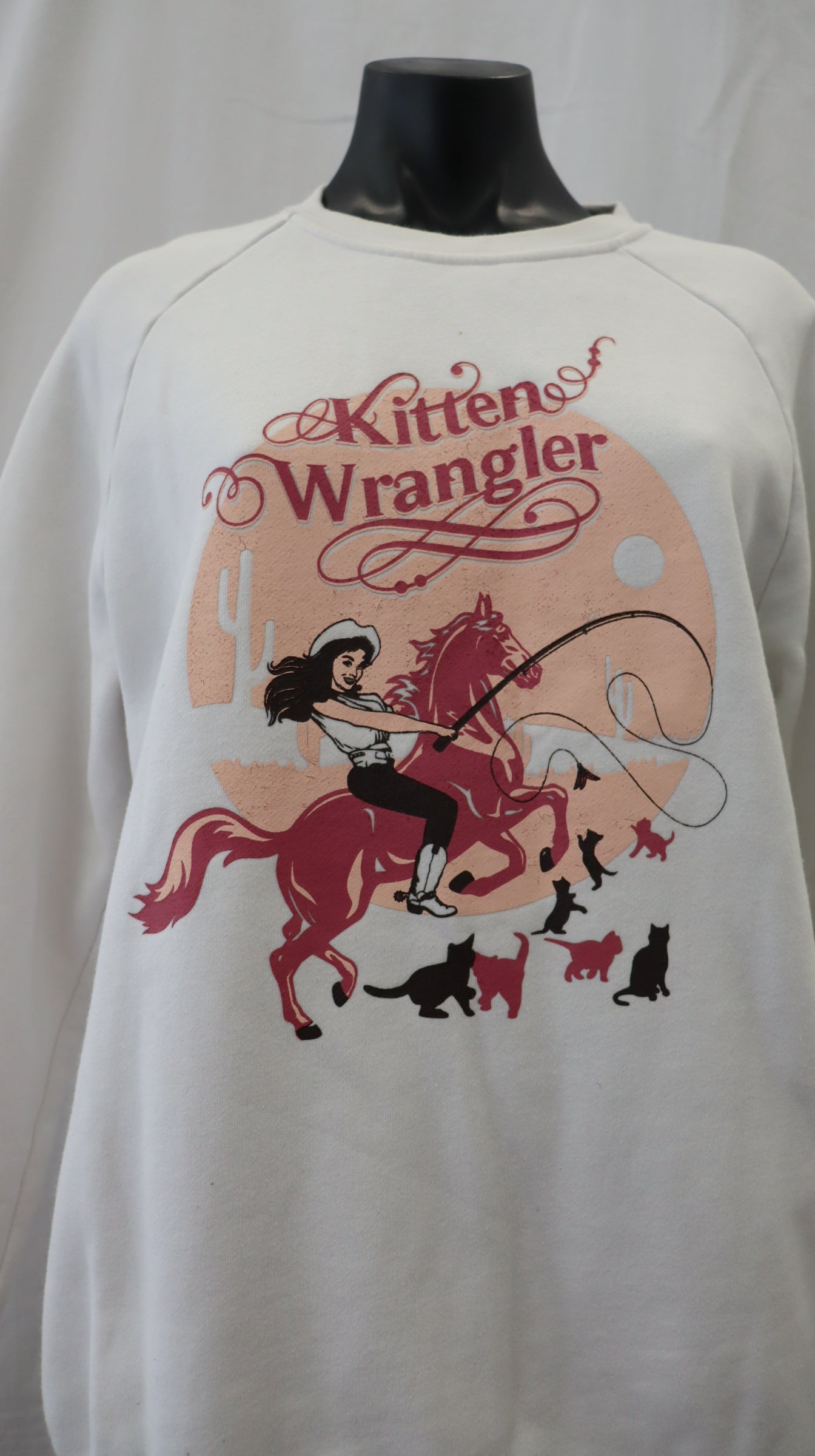 Kitten Wrangler graphic on the front in a pink and brown and white tone, has some marks