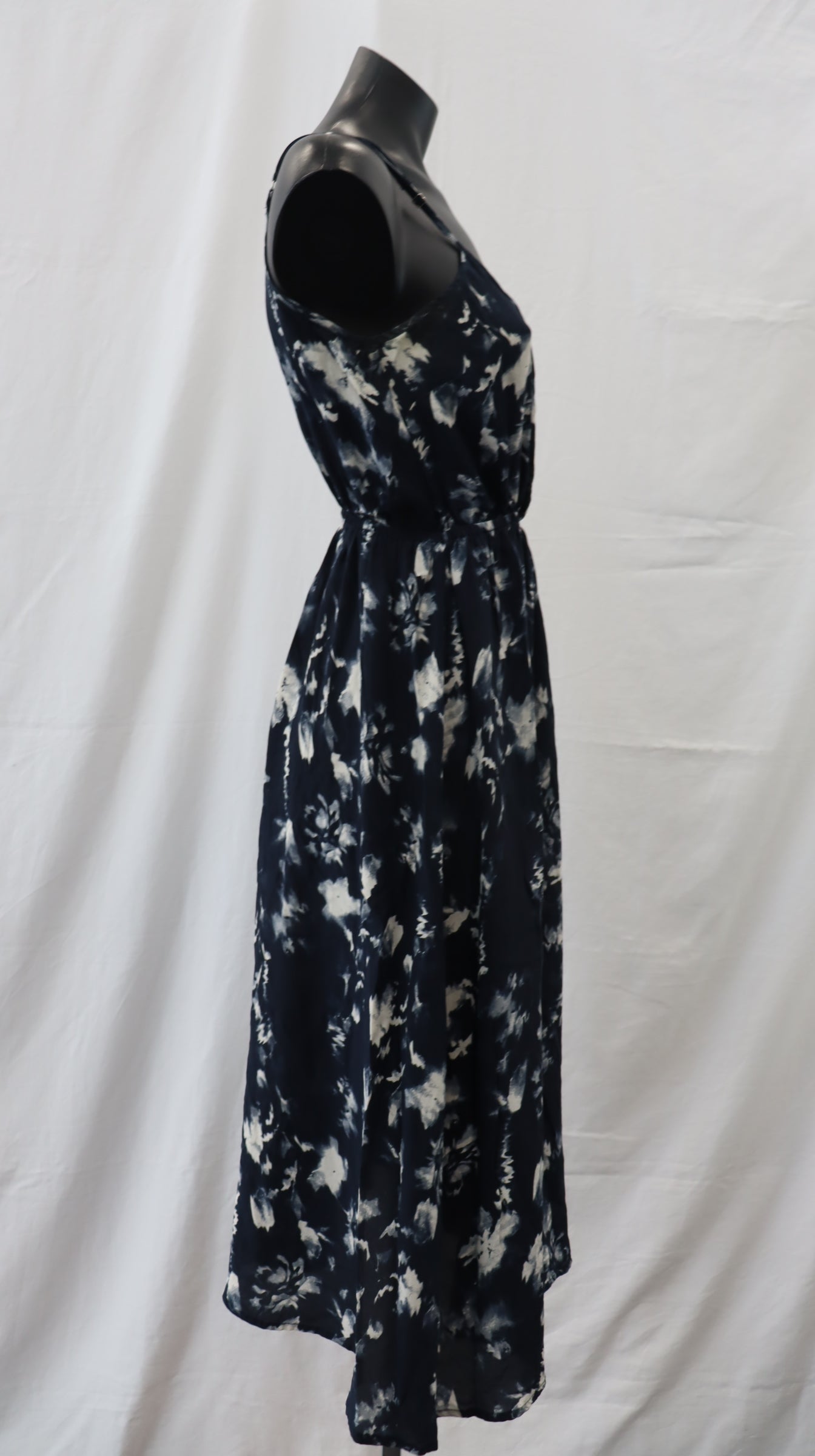 Wrap dress one internal tie and one external side tie, thin adjustable shoulder straps, navy base with white and lighter blue shadow flowers, 100% silk