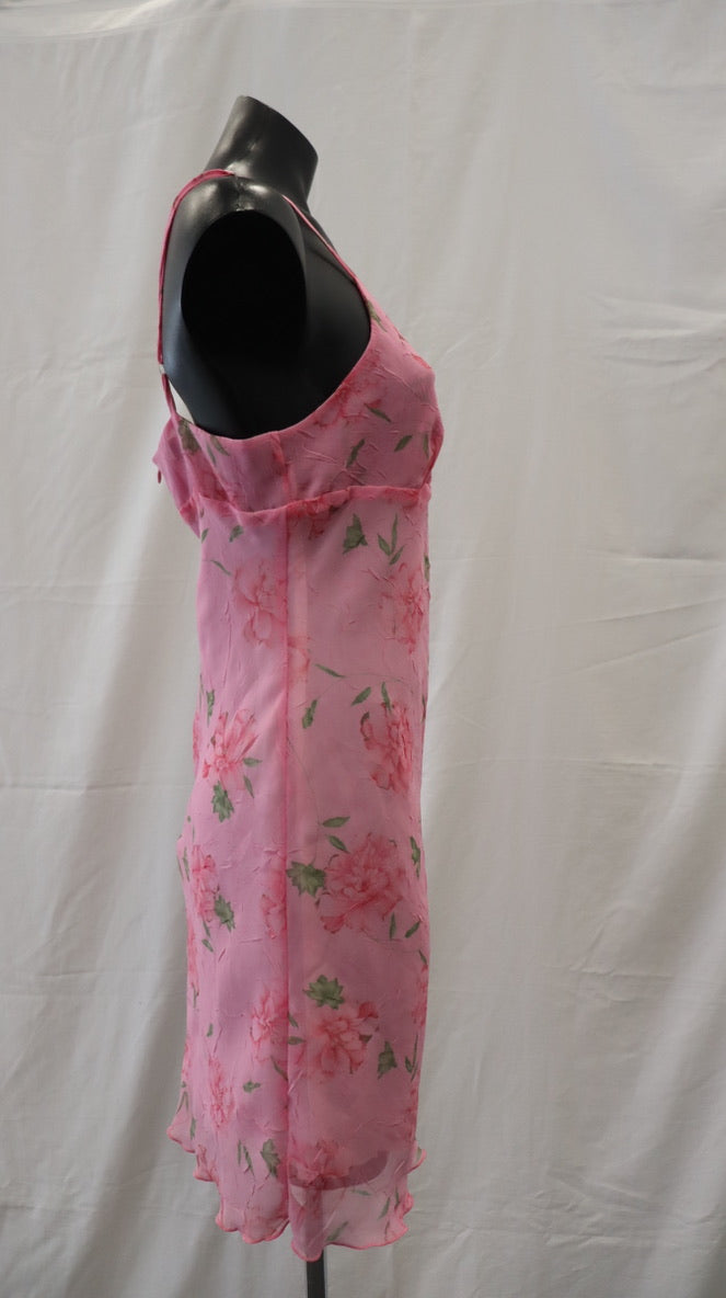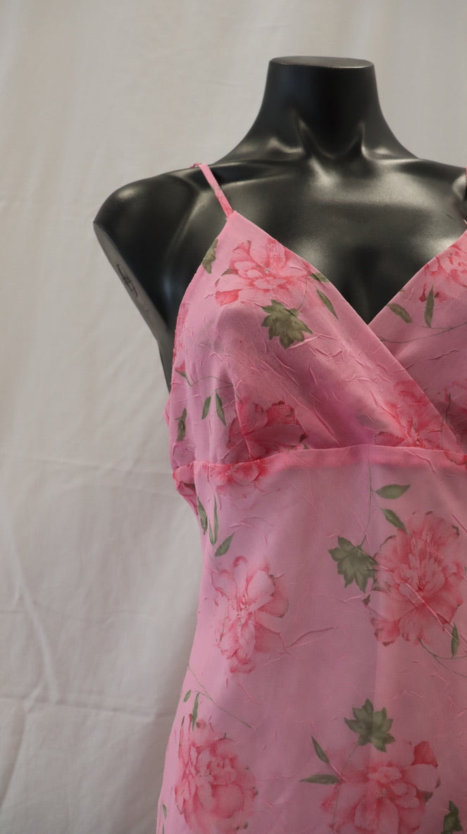 Thin adjustable shoulder straps, bright pink with pink flowers and green leaves, zipper on the back, sheer with a white lining, has a mark on the white lining lower front