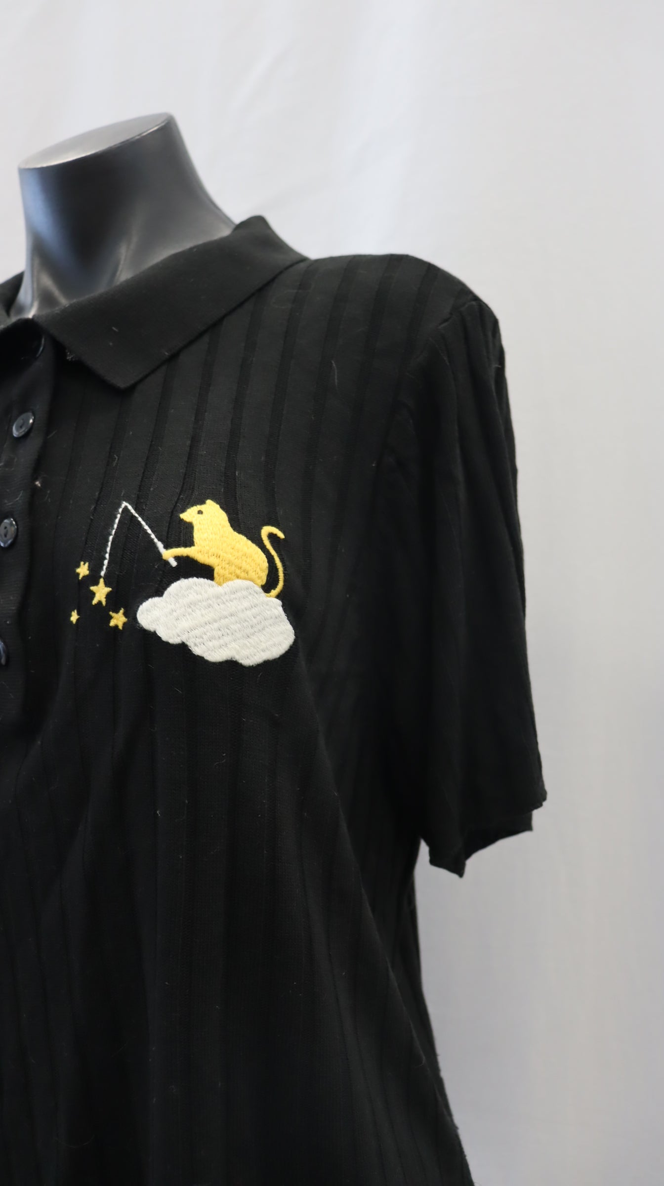 Lightweight knit top, collar, short sleeve, buttons up the front, cat detail embroidered on the front