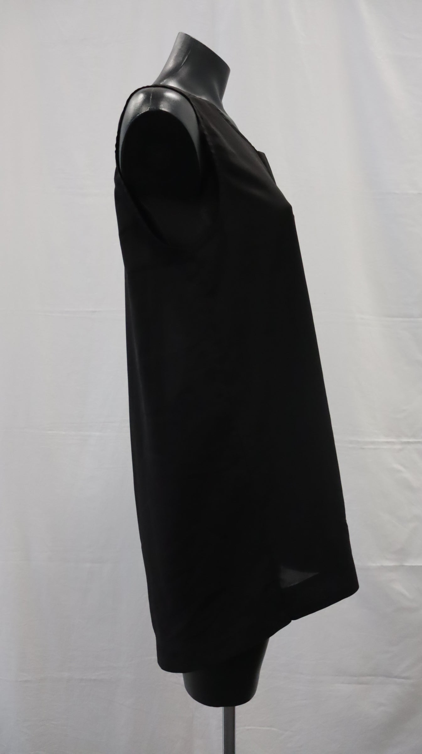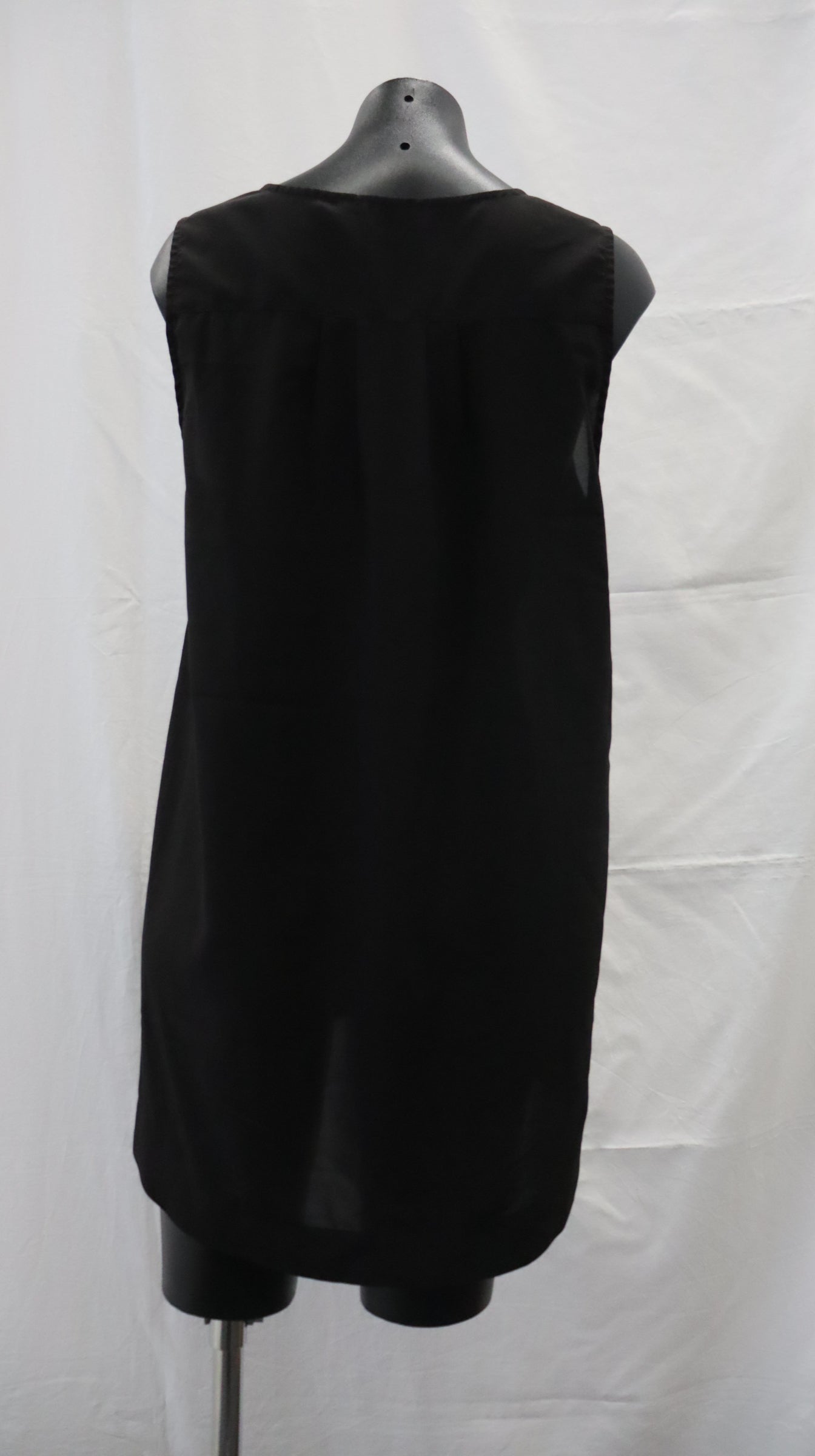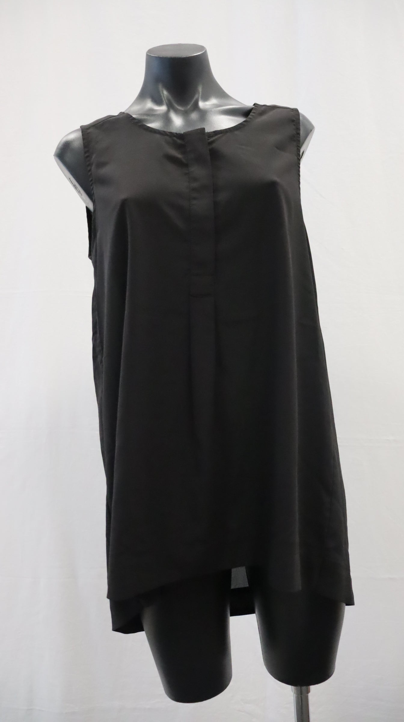 Sleeveless, scoop neckline and then buttons to halfway, 98% polyester 2% spandex, semi sheer, long length, little bit longer at the back