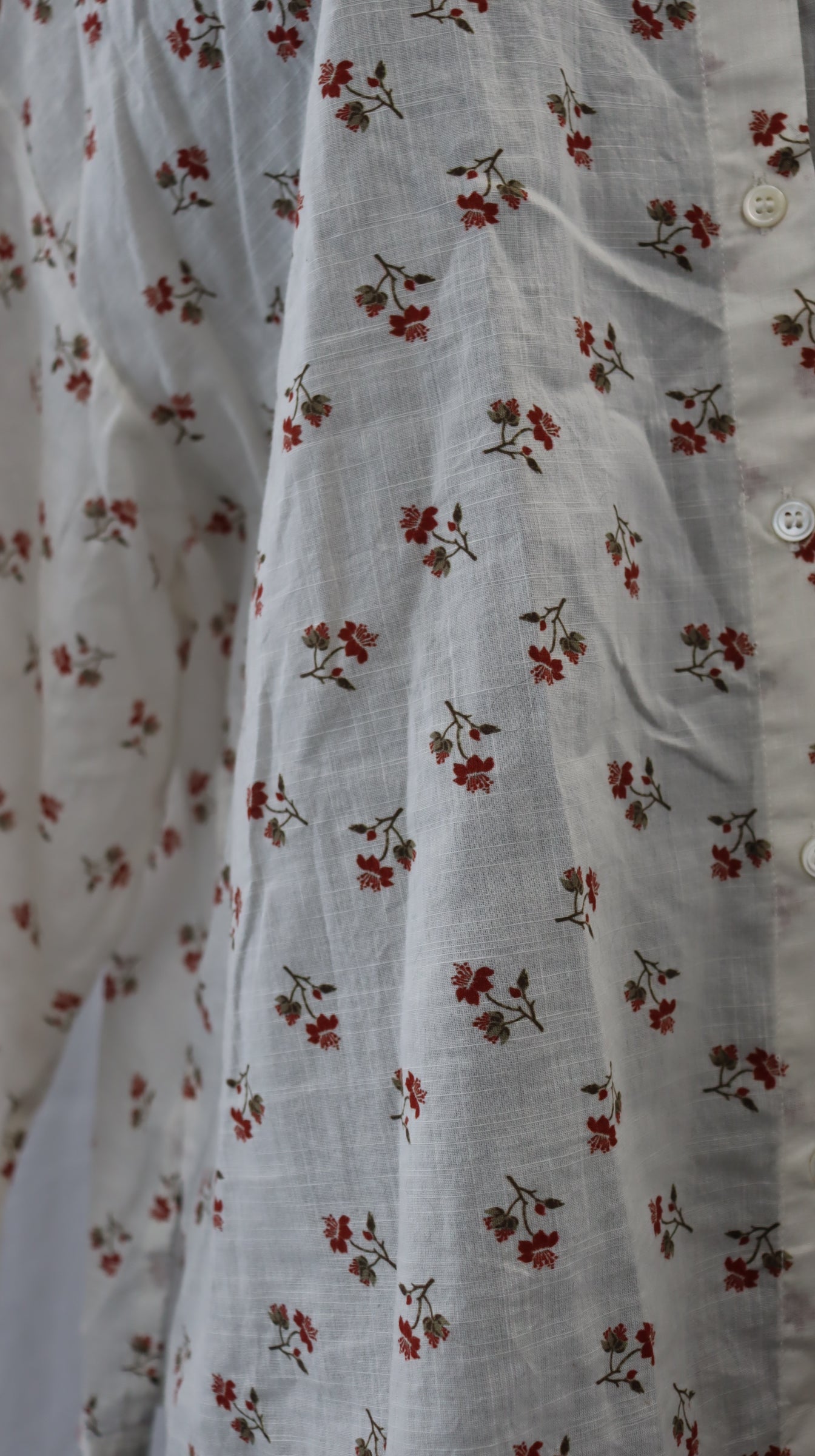 Off white with red little flowers all over, light weight, long sleeve, semi sheer, cotton
