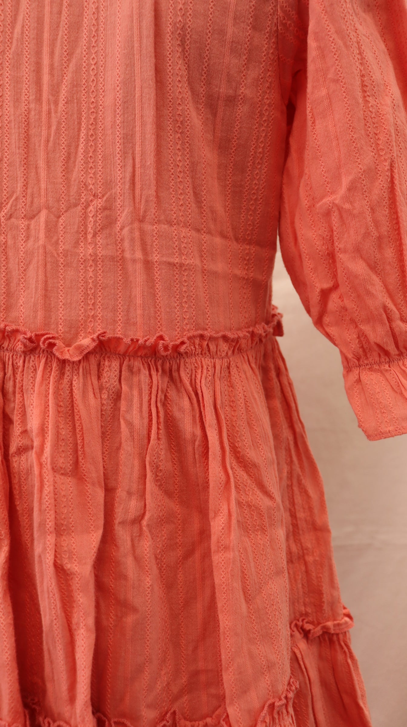 Short sleeve, v neck with tie detail, tiered, fully lined, embroidered stripe pattern, loose fitting