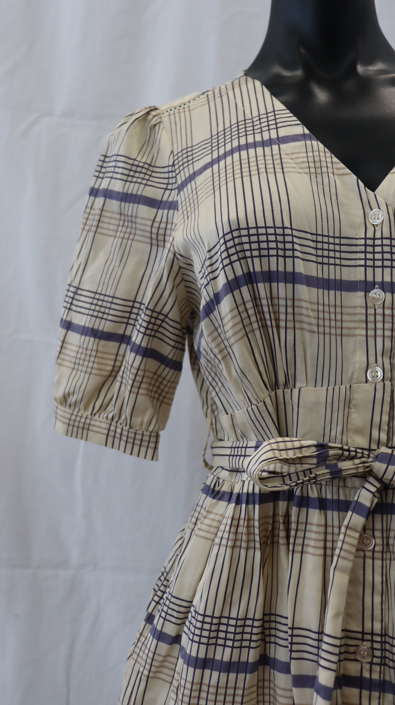 Buttons down the front, optional waist tie, v neck, elastic back of waistband, side seam pockets, short sleeve, beige with a blue and beige plaid