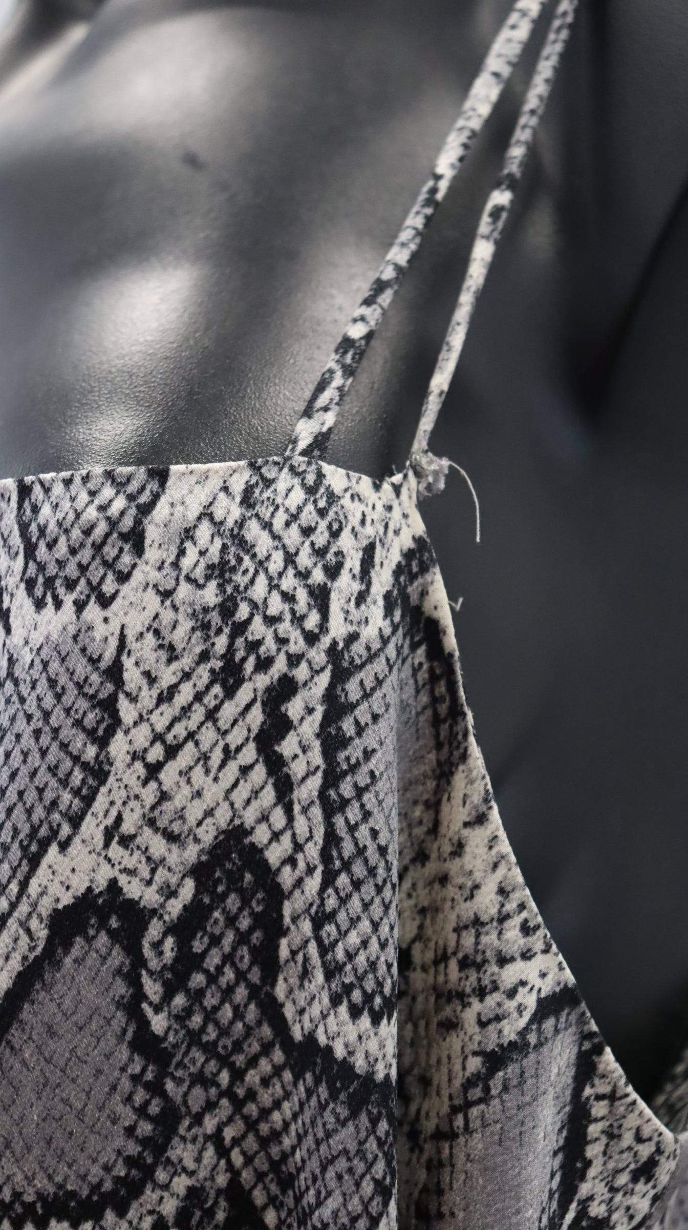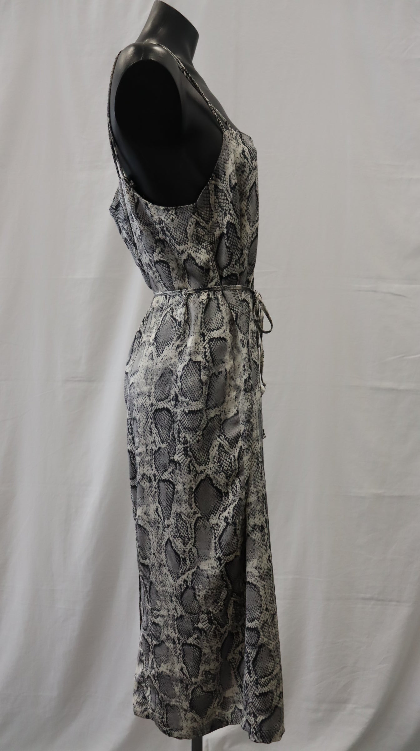 Double non adjustable shoulder straps, optional waist tie, straight cut, centre hemline split on the back, grey and black tone snakeskin pattern, one of the shoulder straps has come away