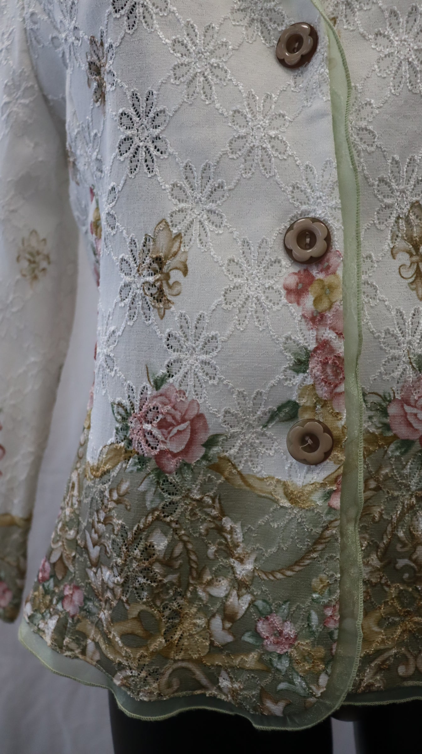 White lace with a pink and green contrast, thin shoulder pads, three buttons down the front