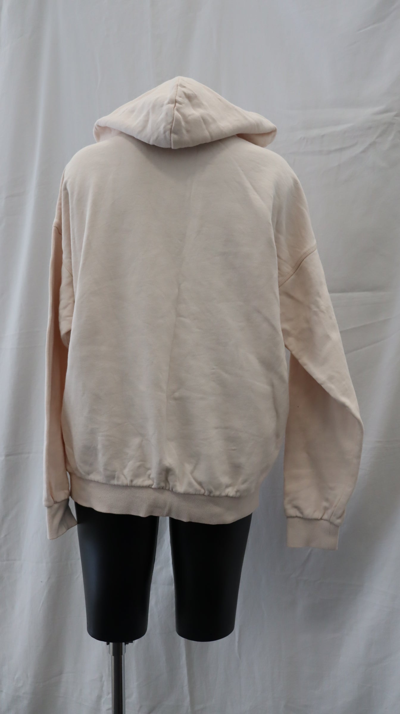 light pink, raised pink logo on the front, pull over, drop shoulder, oversized fit