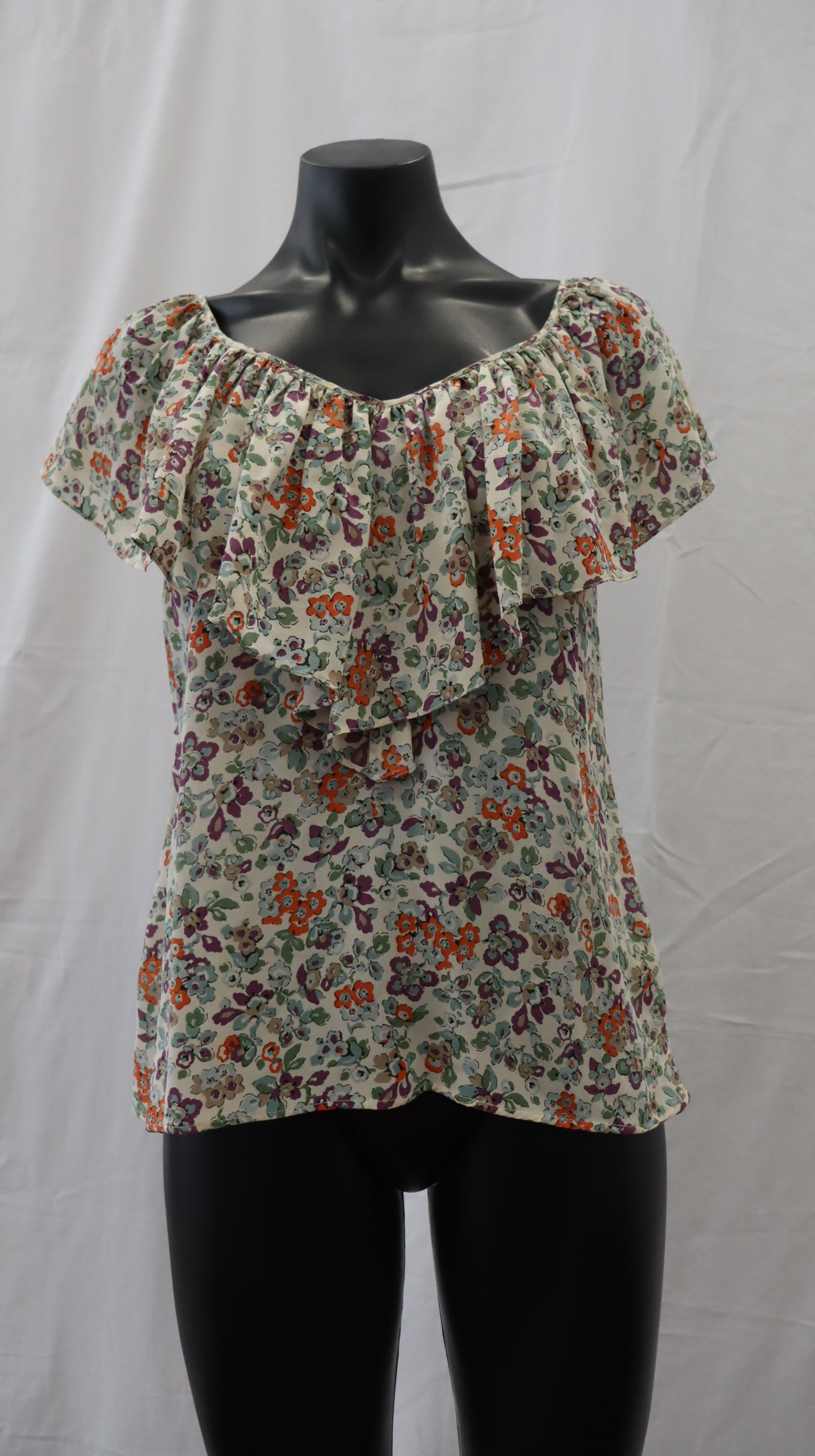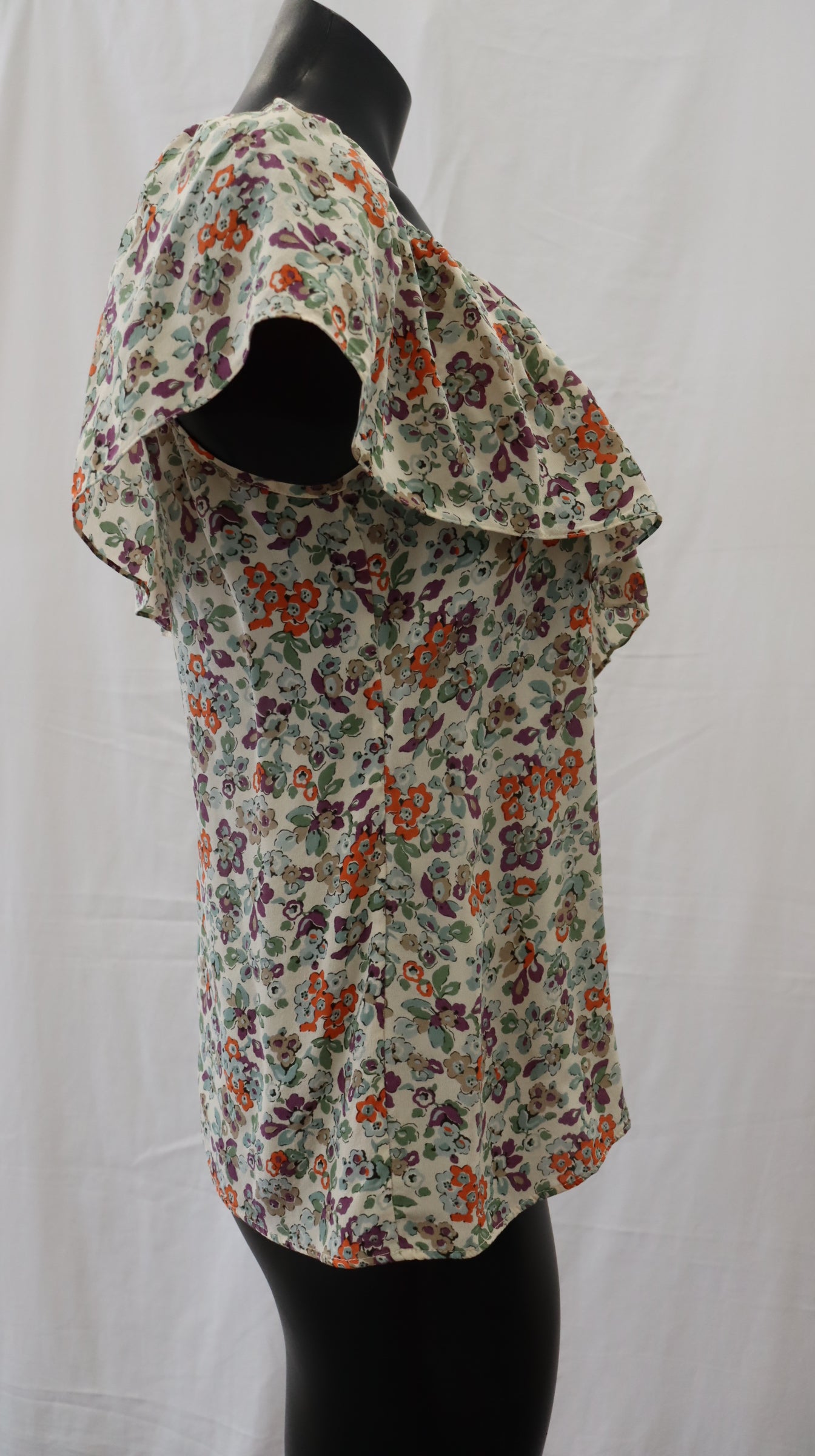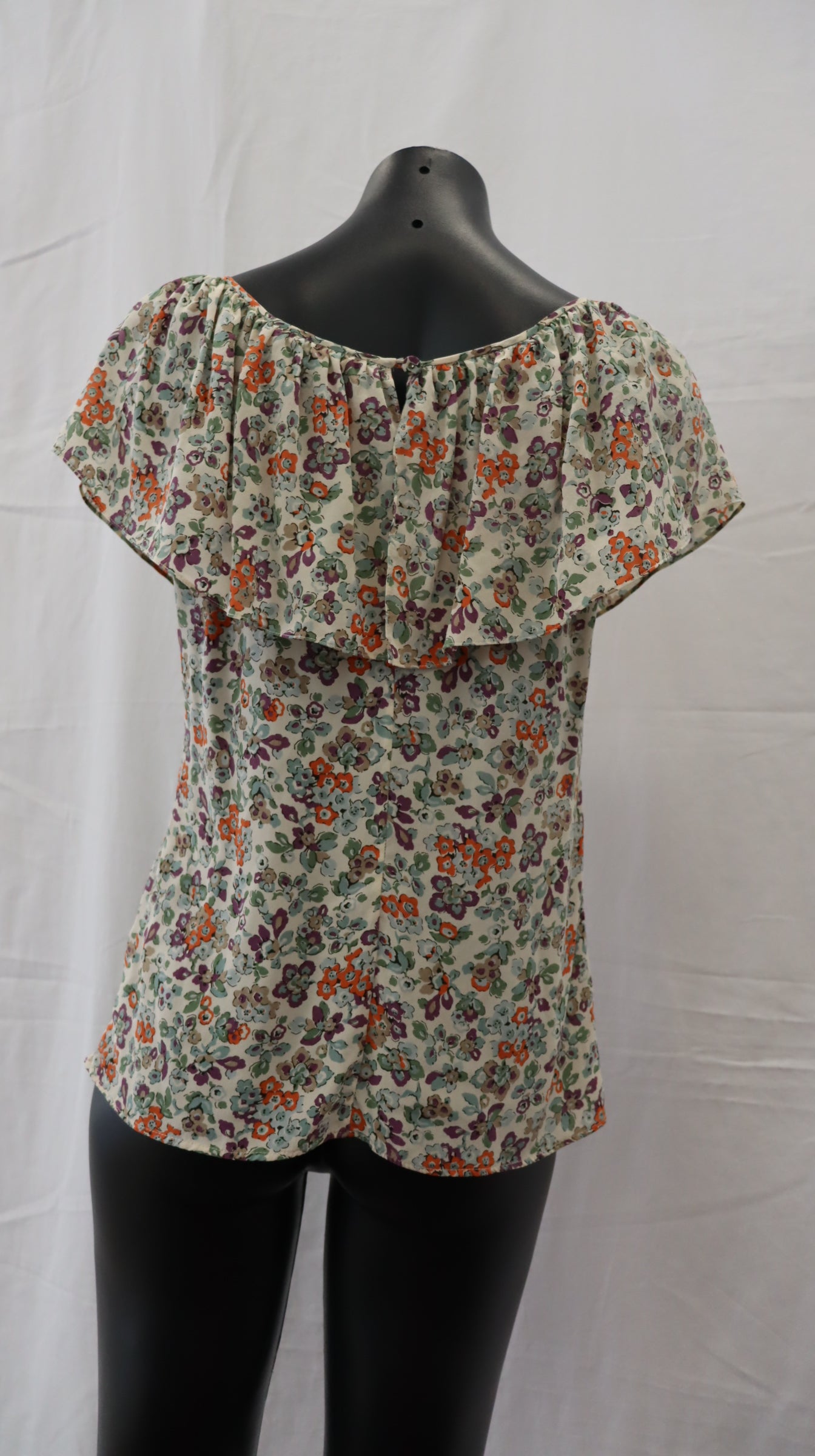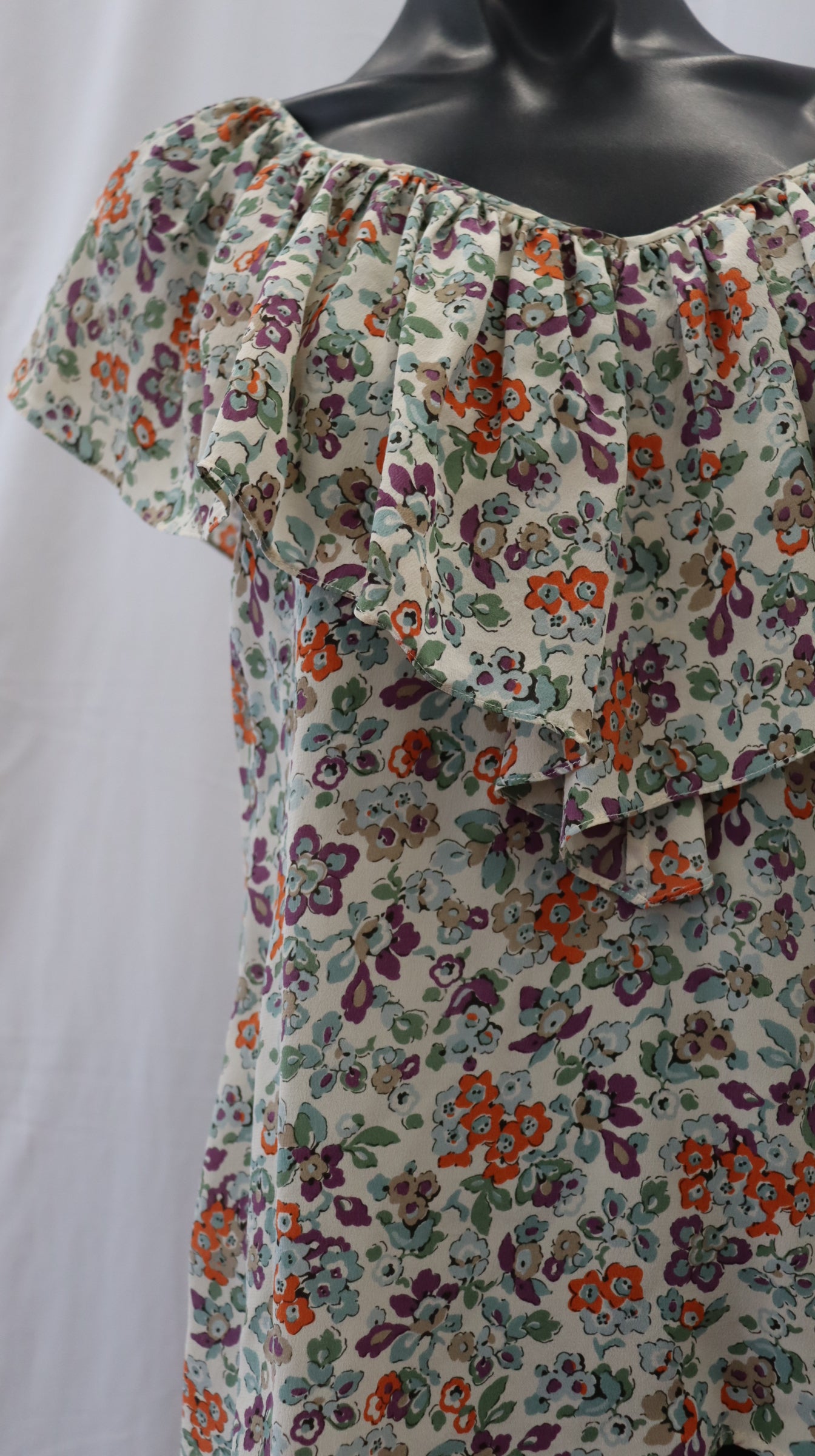 Light grey base colour with orange purple light blue and green tone flowers, button on the back of neck with keyhole cutout, frill detail neckline, silk