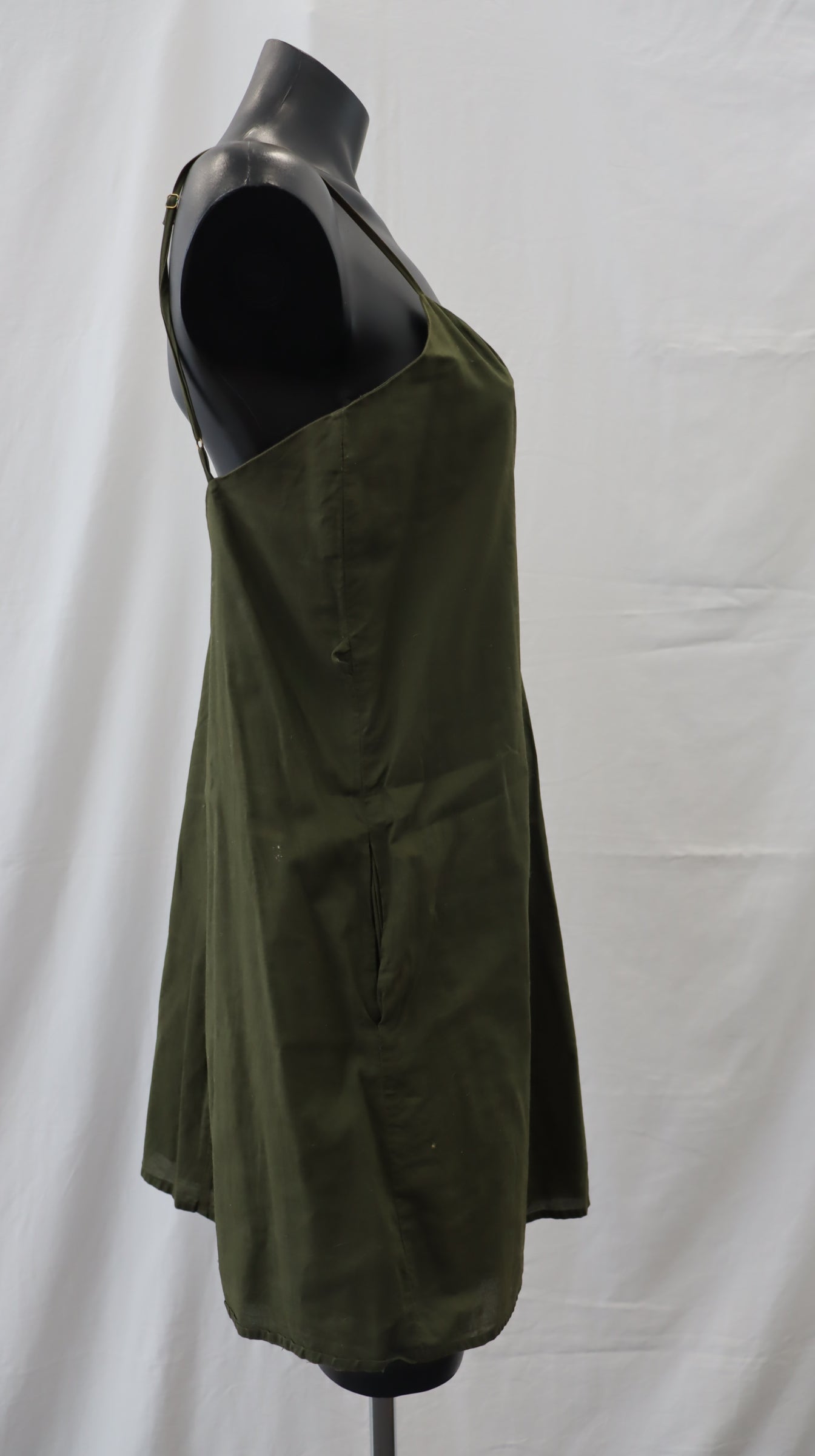 Thin adjustable shoulder straps, v neck, side seam pockets, missing tie