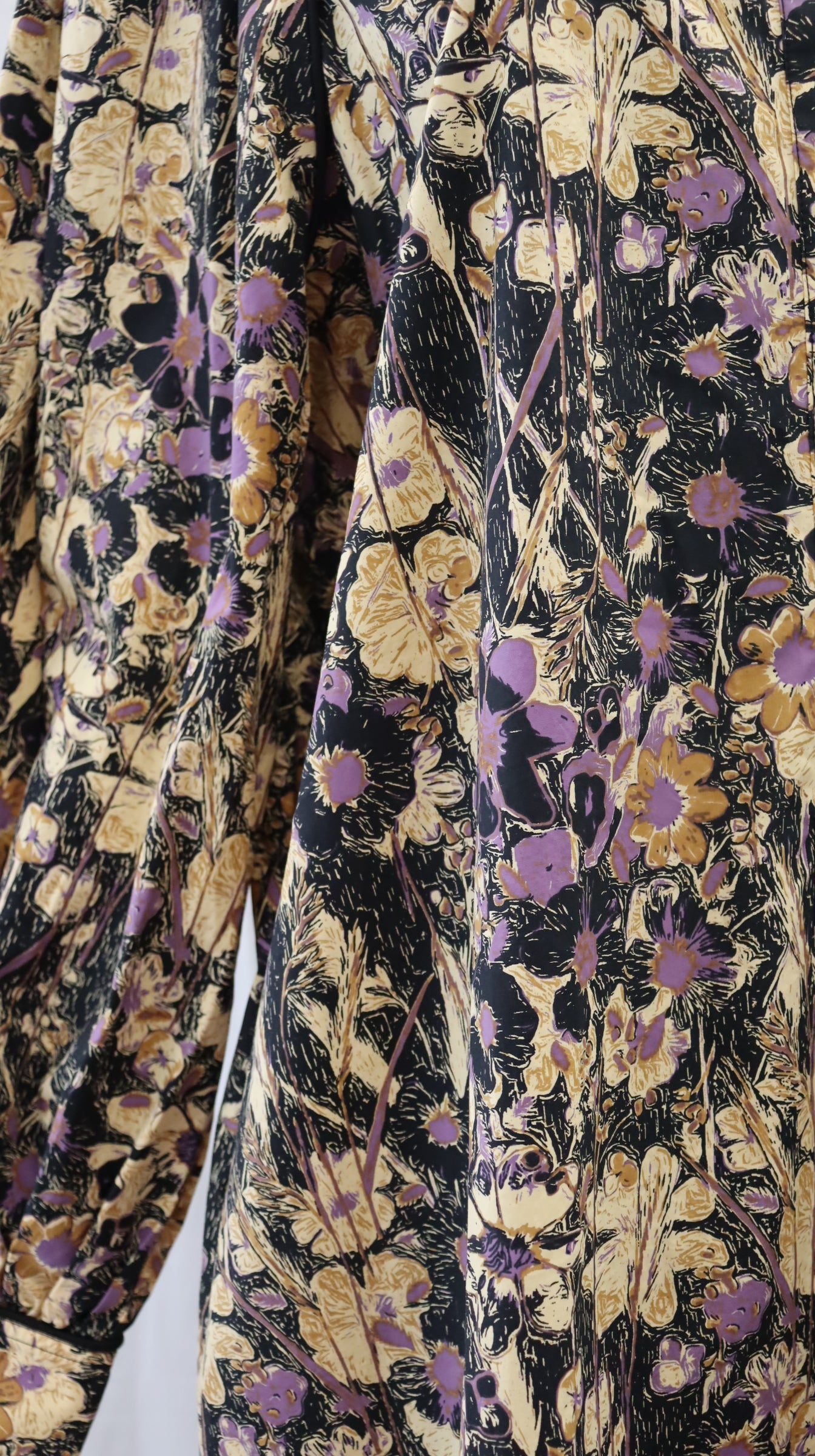 Black beige purple and tan floral print, buttons half way, long sleeve, side seam pockets, cotton, BNWT