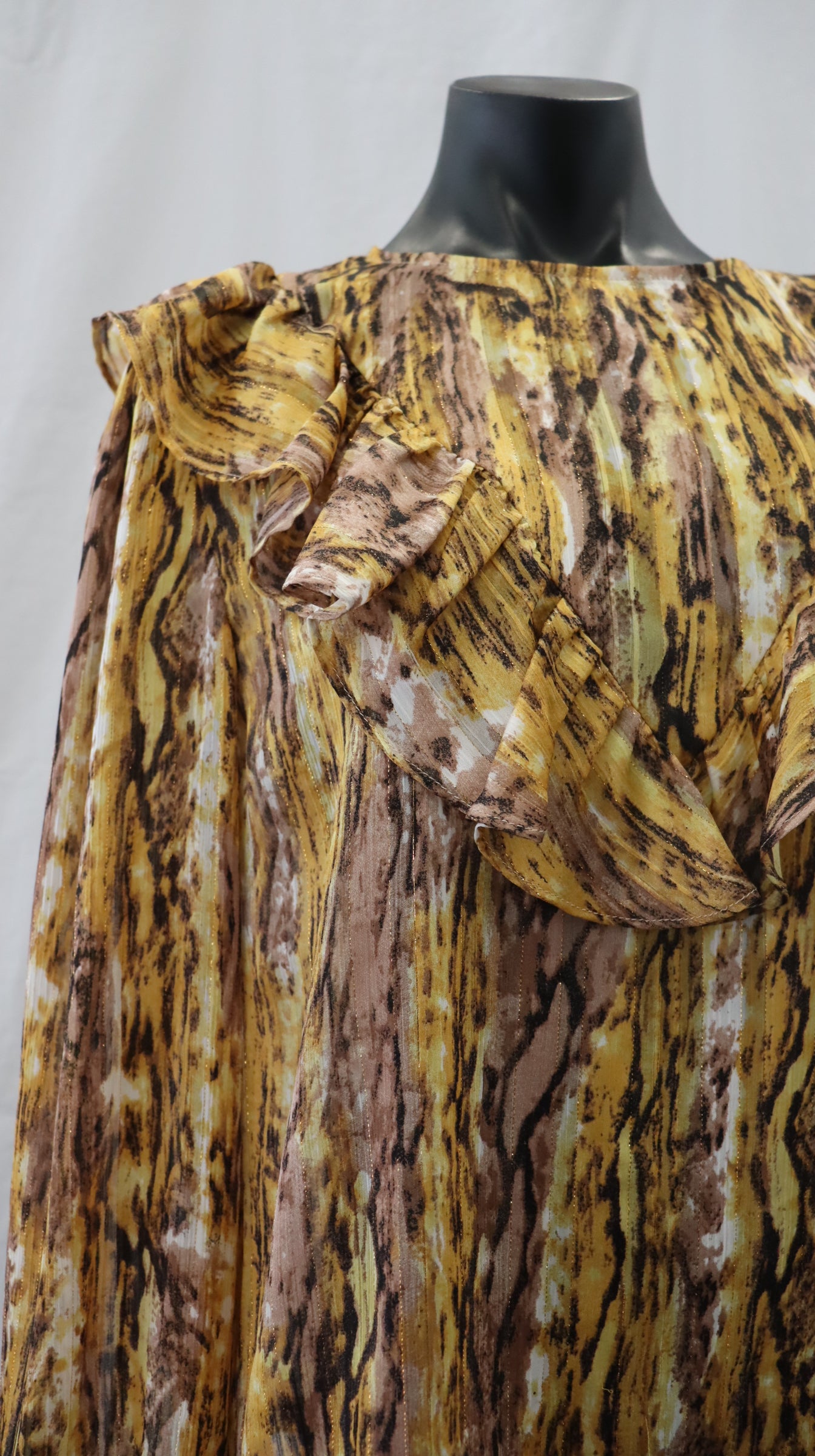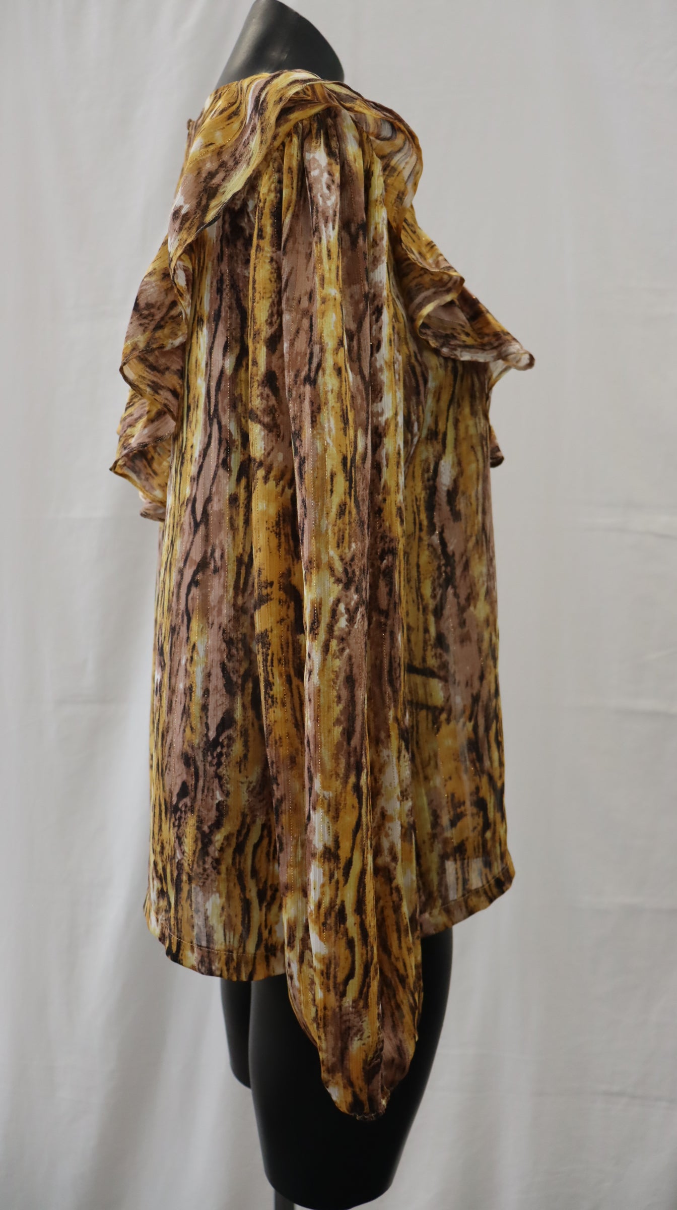 Brown yellow white tone animal pattern stripe, button on the back of neck with keyhole cutout, v frill detail neckline