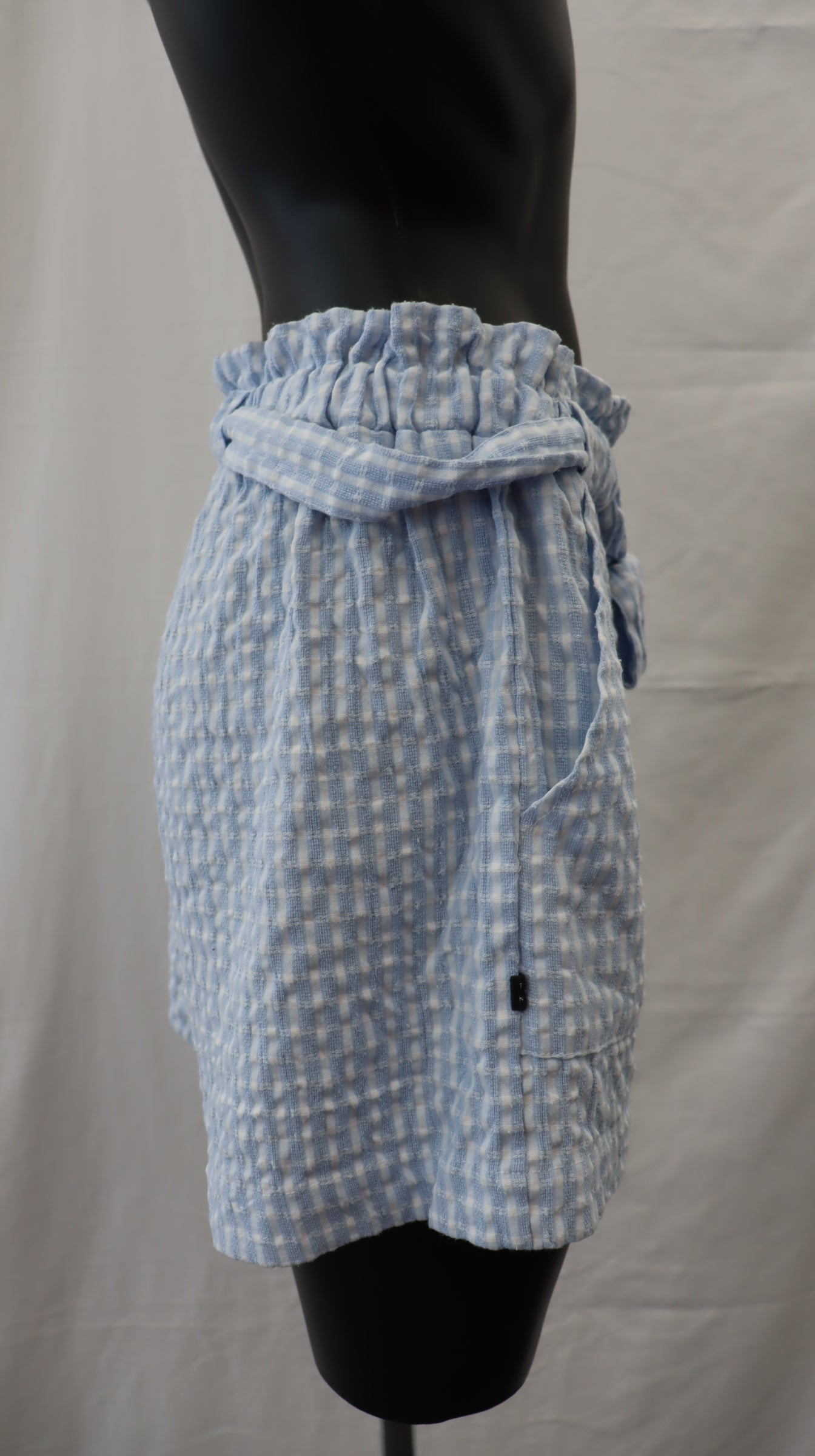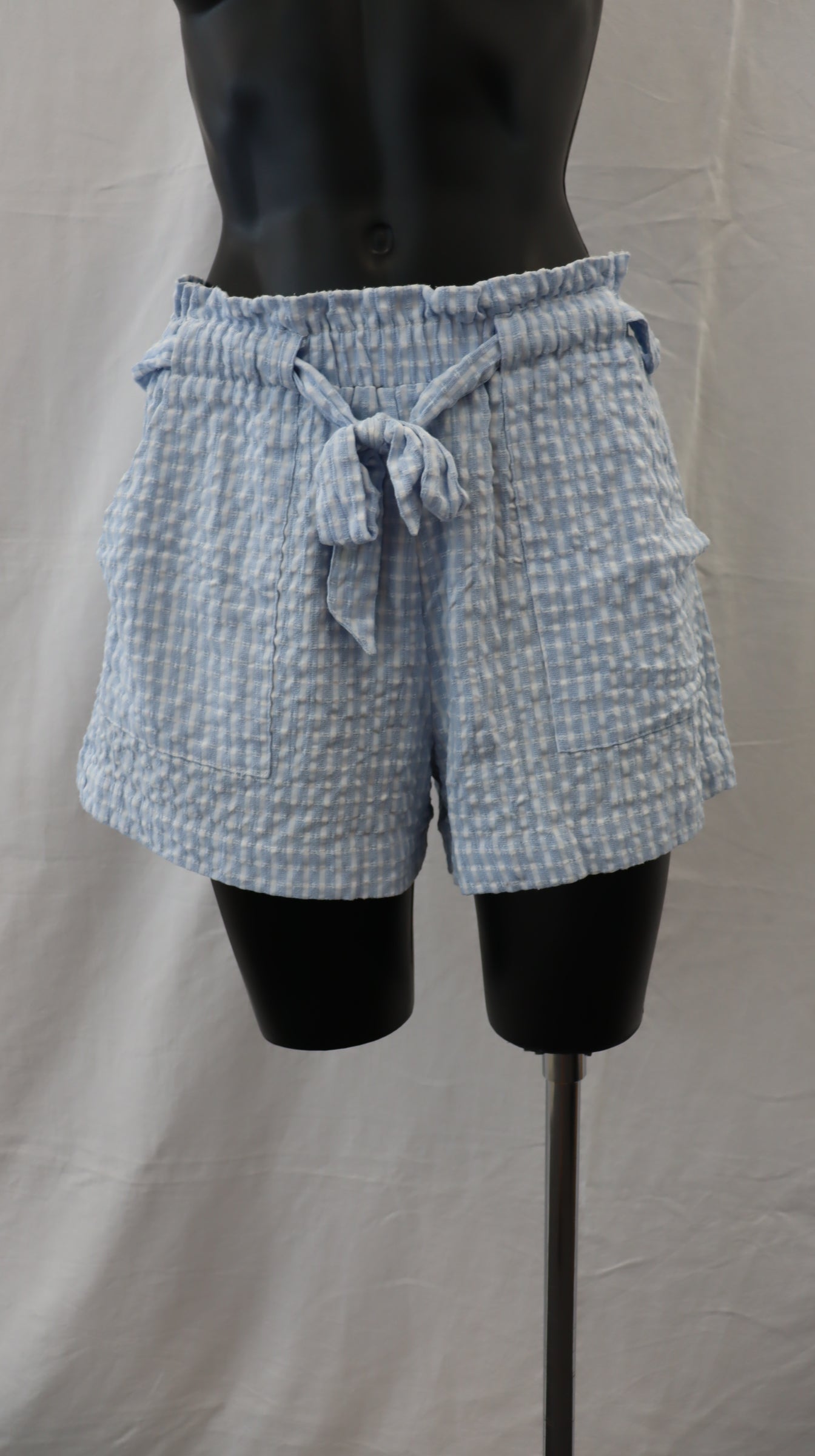 Light blue and white plaid, elastic waist with tie, side pockets, 60% cotton 40% polyester